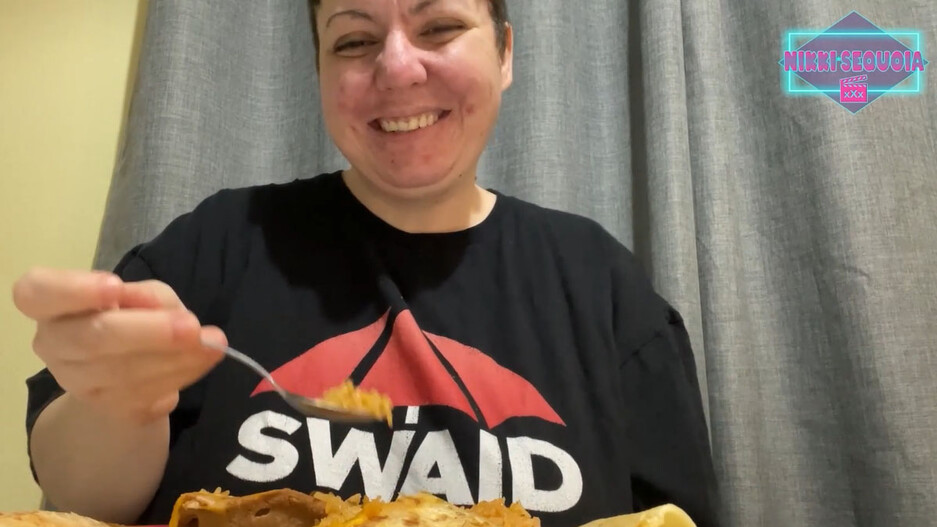 I'm eating a leftover quesadilla with rice and beans. Why are you staring so hard? Does it give you wood or something? Ha! It does!! Weird, but OK... wanna jerk off then? Fuck it, no one else is home just whip your cock out and stroke while I shove more food in my mouth.